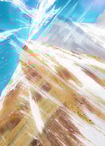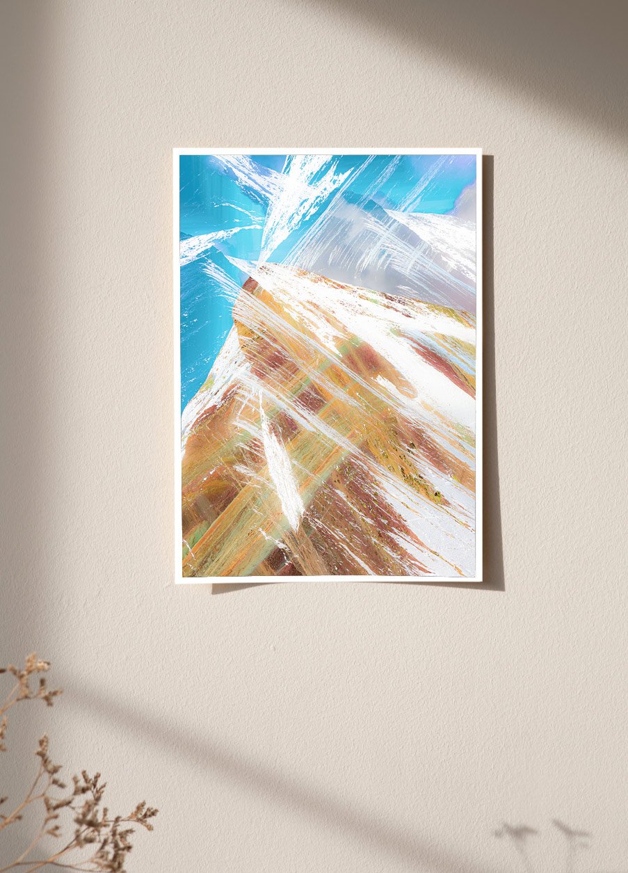 Multi-exposure photo combined with (ICM) of Rainbow Mountain, Peru. A dynamic view of a mountain with sharp peaks and vibrant colors, blending natural and abstract elements. Streaks of white give an impression of wind or snow across the scene.